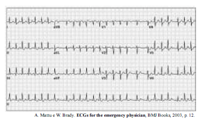 Um homem com 60 anos de idade foi atendido em sala de emergência, apresentando um quadro de palpitações taquicárdicas intensas, associadas a tonturas e sensação de escurecimento visual. O episódio se iniciou 2 horas antes, após ter consumido grande quantidade de bebida alcoólica destilada (aguardente). Referiu ser portador de hipertensão arterial, em tratamento irregular, e desconhecia outras doenças. Ao exame físico, observou-se paciente com sinais de embriaguez, sonolento, confuso, torporoso, dispnéico, com freqüência respiratória de 28 irpm, freqüência cardíaca de 150 bpm e pressão arterial de 85 mmHg × 45 mmHg. Apresentava também pulmões com estertores em terços inferiores de ambos hemitóraces, ritmo cardíaco taquicárdico irregular, em 3 tempos, com terceira bulha, sem sopros e com pulsos periféricos filiformes. O abdome estava livre, sem visceromegalias, com ruídos hidroaéreos presentes e normoativos. As extremidades não apresentavam edema ou lesões e havia cianose +/+4 e perfusão capilar lentificada. Foi realizado uma eletrocardiografia convencional, com 12 derivações, com derivação D2 longa (velocidade do papel = 25 mm/s e calibração de 1 cm = 1 mV), cujo eletrocardiograma é mostrado na figura abaixo.