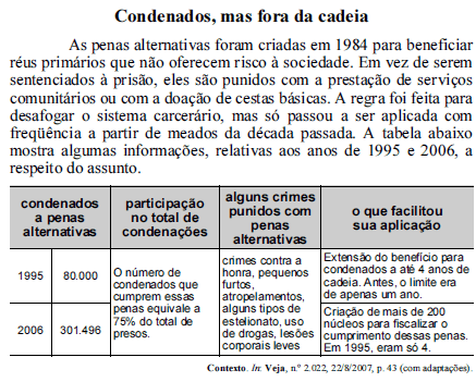 Considere-se que existiam, em 2006, 223 núcleos para fiscalizar o cumprimento das penas alternativas. Nessa situação, em 2006, cada um desses núcleos fiscalizava, em média, 1.352 condenados a penas alternativas.{TITLE}