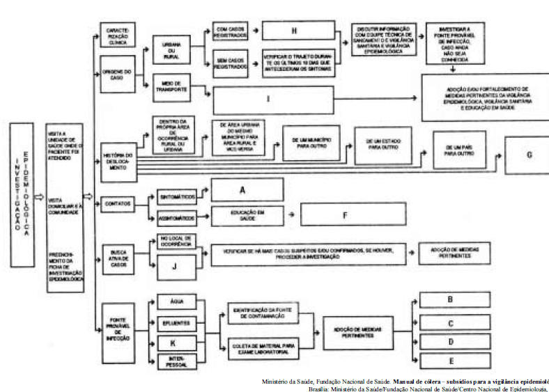 A figura acima mostra um fluxograma para execução das atividades relacionadas a suspeitos de cólera. Com base nesse fluxograma e sobre a cólera, causada pela bactéria Vibrio cholerae, julgue os itens que se seguem.