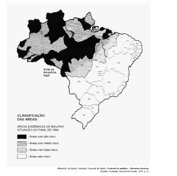 O mapa acima mostra as áreas endêmicas de malária, no final de 1994. A partir do mapa e dos conhecimentos sobre a malária, julgue os itens a seguir.