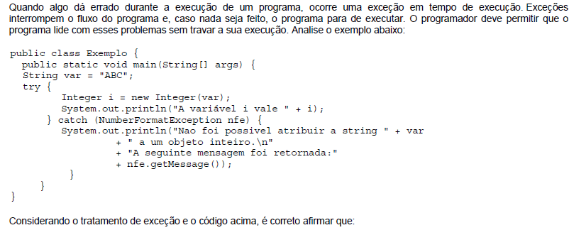 A. Ao ser executado, o programa Java acima retorna: Nao foi possivel atribuir a string ABC a um objeto inteiro. A seguinte mensagem foi retornada:For input string: "ABC"