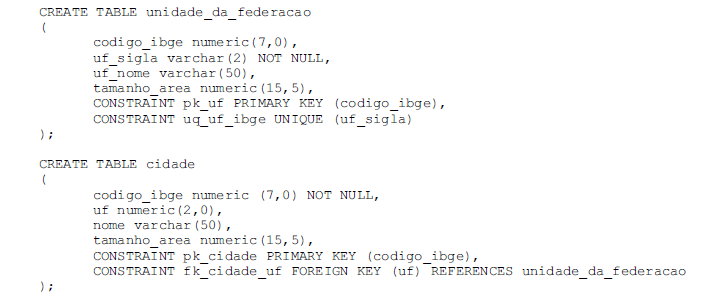 Considerando a linguagem de definição de dados e o código acima, que tem como objetivo criar as relações unidade_da_federacao e cidade, representando dados referentes a estados e municípios da Federação, julgue os próximos itens.