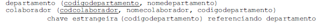 Em SQL, para se listarem os nomes dos departamentos da tabela departamento que não possuem colaboradores, é correto utilizar o código abaixo.