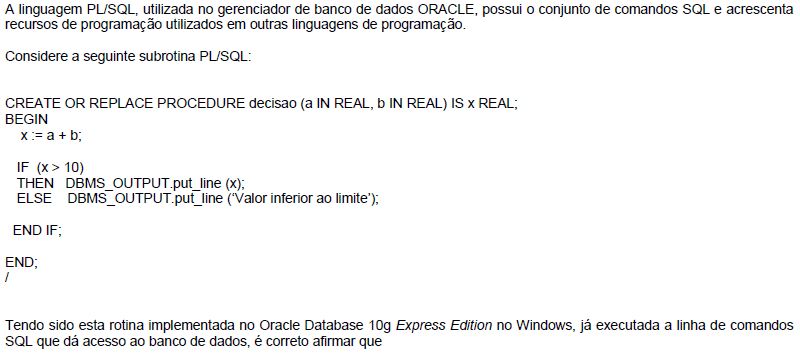 a stored procedure decisao recebe 2 parâmetros reais e apresenta apenas o resultado da adição dos valores cuja soma seja maior ou igual a 10.