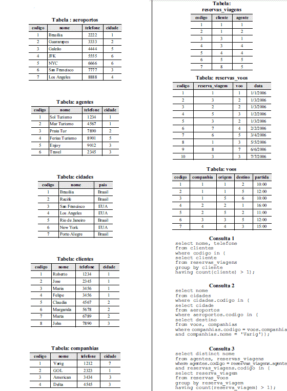 A seguir, são apresentadas 8 tabelas de um banco de dados e três consultas SQL.