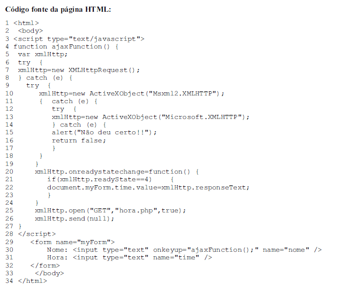 A seguir, são mostrados o código fonte de uma página HTML, o código PHP que está em um arquivo denominado hora.php e o resultado produzido por esses códigos em um navegador Internet Explorer 8.