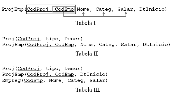 Considerando as tabelas relacionais I, II, e III e suas dependências funcionais apresentadas acima, julgue os próximos itens.