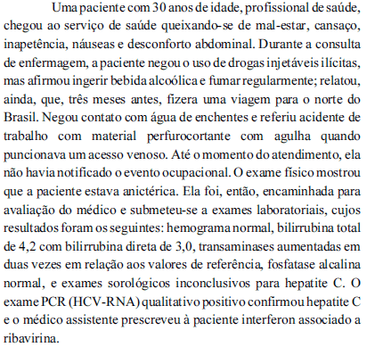 Considerando-se as normas da vigilância à saúde e de controle de infecção hospitalar, é correto afirmar que, ao procurar ajuda profissional após manifestação dos sintomas relacionados ao acidente de trabalho, a paciente agiu em conformidade com o manual de condutas em exposição ocupacional a material biológico, publicado pelo Ministério da Saúde.