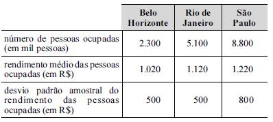 A tabela acima, adaptada do sítio www.ibge.gov.br, apresenta as estimativas do número de pessoas ocupadas e do rendimento médio das pessoas ocupadas, em julho de 2007, nas regiões metropolitanas de Belo Horizonte, Rio de Janeiro e São Paulo. Com base nessas informações, julgue os itens subseqüentes.