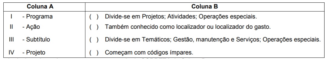 Considerando a classificação programática das despesas públicas, relacione os itens da coluna A com as características listadas na Coluna B: