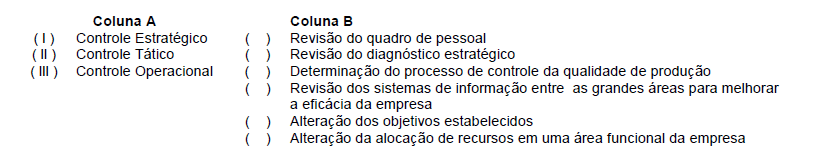Com relação às decisões de controle e avaliação do Planejamento Estratégico, correlacione as colunas A e B: