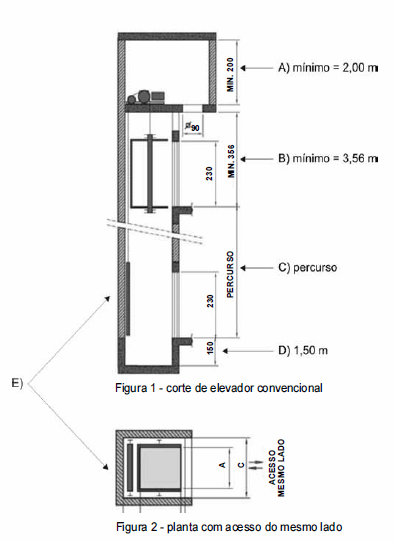 O ambiente identificado por B tem medida necessária para conter a cabine e o gancho de montagem do elevador.