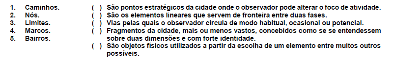 A cidade não é apenas um objeto de percepção para milhões de pessoas de classe e de caráter muito diferentes; é também o produto da atividade de numerosos construtores que modificam constantemente sua estrutura (Choay apud Lynch, Kevin. 1960. p. 308). Sobre esse tema, numere a coluna da direita de acordo com sua correspondência com a coluna da esquerda.
