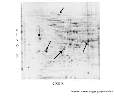 Considerando a figura acima, bem como os princípios da eletroforese bidimensional, julgue os seguintes itens.