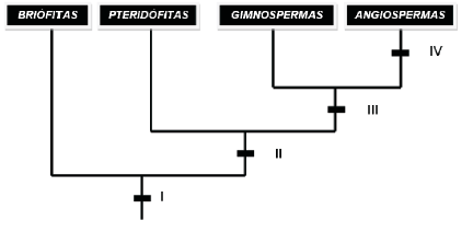 A seguir, tem-se o cladograma simplificado dos grupos vegetais, indicando pelos números (I, II, III e IV) algumas novidades evolutivas.