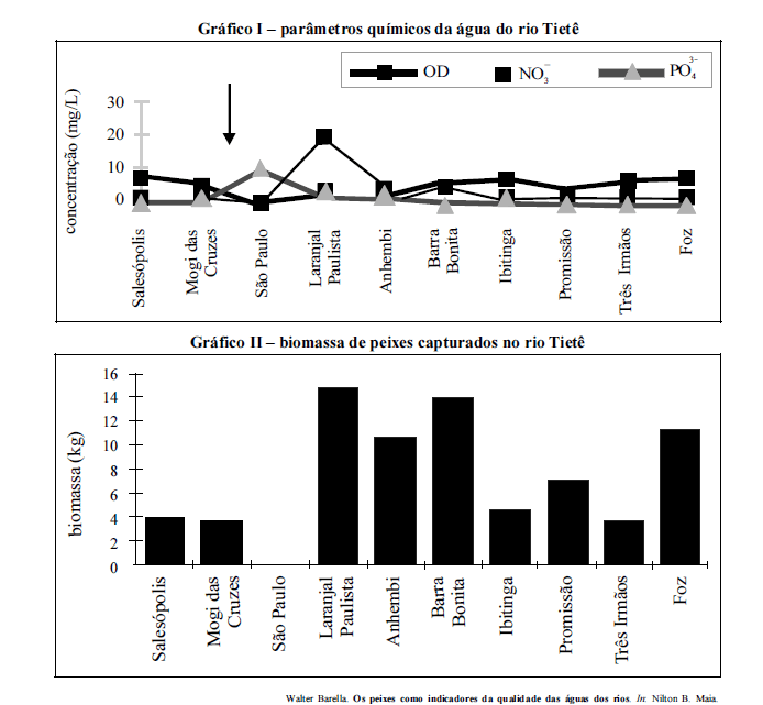 Os gráficos I e II acima comparam aspectos ecológicos ao longo do rio Tietê SP desde sua nascente até a foz. Por meio dos gráficos, podem ser analisadas as diferentes formas de uso e ocupação da terra às suas margens, e as modificações no próprio curso de água, em função das inúmeras barragens implantadas. O curso do rio foi dividido em trechos, que se encontram nominados nos gráficos. No gráfico I, mostram-se as características físico-químicas da água: porcentagens de oxigênio dissolvido (OD), nitrato (NO3 !) e fosfato (PO4 3!). A seta indica o início da região metropolitana de São Paulo (RMSP). O gráfico II apresenta a biomassa dos peixes capturados nos respectivos trechos do rio. Considerando essas informações, julgue os itens de 96 a 103.