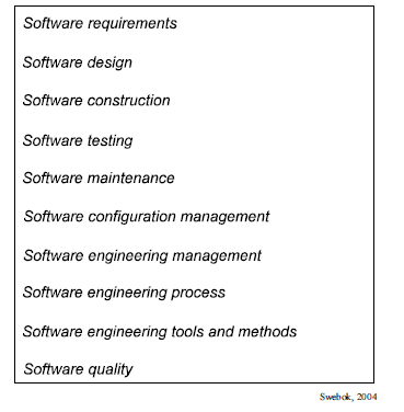 A figura acima apresenta um sumário das áreas usualmente reconhecidas como sendo praticadas na engenharia de software. Considere as seguintes atribuições profissionais exigidas em uma organização: desenvolver sistemas em ambiente de grande porte, atuando preferencialmente nas fases de implementação de códigos e transição do processo de desenvolvimento adotado, utilizando-se de metodologia e ferramentas CASE/IDE homologadas na organização, visando à racionalização e à otimização dos processos do cliente. Julgue os itens a seguir acerca dos conceitos e das áreas de engenharia de software listadas e seus relacionamentos com as atribuições profissionais acima descritas.