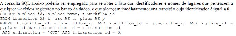 Julgue os itens a seguir, considerando que os registros inseridos no esquema workflow apresentado no texto II representam adequadamente as informações de vários workflows quaisquer, individualmente identificados com números 0, 1, 2, 3 etc.