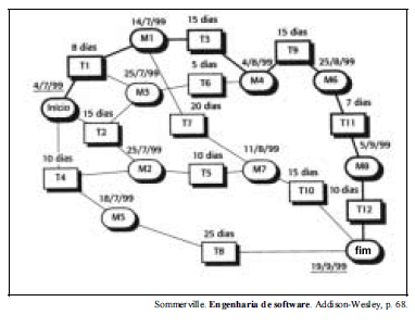 A figura acima apresenta um diagrama de PERT de programação de um projeto de desenvolvimento de software em que estão apresentadas tarefas de T1 a T12 e marcos de M1 a M8, com suas durações e datas de conclusão, respectivamente. O diagrama deve ser lido da esquerda para a direita e de cima para baixo. A partir da análise da programação acima, e considerando o cenário de execução do projeto, julgue os itens a seguir.