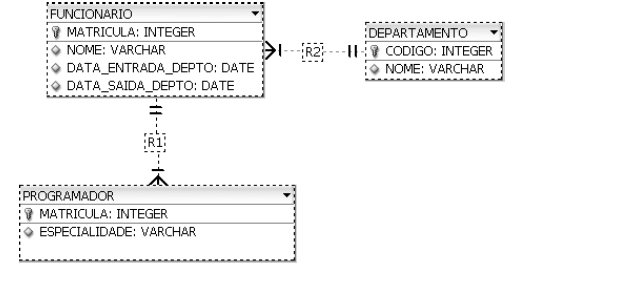 A relação R1 do diagrama relacional apresentado poderia ser denotada por uma especialização no modelo entidade-relacionamento.Ciência da Computação - Modelo de Entidade-Relacionamento - Centro de Seleção e de Promoção de Eventos UnB (CESPE) - 2009