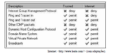 A figura acima apresenta uma tabela de configuração de um firewall instalado em um único computador. A tabela descreve o estado atual de permissões e bloqueios do fluxo de rede. A partir da análise dessa tabela e considerando as características de firewalls, julgue os itens seguintes.