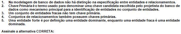 A definição de entidades, relacionamentos, chave candidata, chave primária e outros conceitos sobre os Bancos de Dados são importantes em Sistemas de Informação. Leia atentamente as afirmações abaixo: