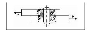 O diâmetro do rebite mostrado na figura acima mede 20 mm e o esforço cortante F a que está submetido vale 31.400 N. Com relação à geometria e à resistência desse rebite, julgue os itens seguintes.