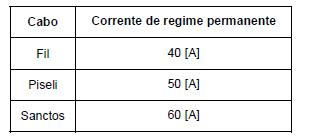 Para o projeto de uma instalação elétrica comercial, alimentada por meio de um circuito monofásico constituído por cabos monofásicos isolados, foram selecionados três cabos distintos. Esses cabos estão apresentados na tabela abaixo, bem como a corrente de regime permanente, que produz a maior temperatura que a isolação do cabo pode atingir continuamente em serviço normal.