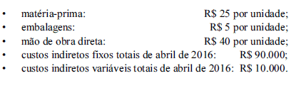 Considerando a inexistência de estoques de períodos anteriores e que a empresa produziu, em abril de 2016, 5.000 unidades totalmente acabadas do referido produto, os valores do custo unitário de produção de abril de 2016 calculados de acordo com o método do custeio por absorção e com o método do custeio variável são, respectivamente: