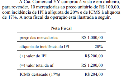 Considerando as informações acima e sabendo que a Cia. Comercial YY é contribuinte do ICMS e não do IPI, julgue os itens a seguir.