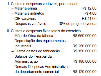 Considerando apenas esses dados, se a companhia utilizasse o sistema de custeio variável, seu lucro líquido no exercício, antes dos tributos sobre o lucro, corresponderia, em R$, a: