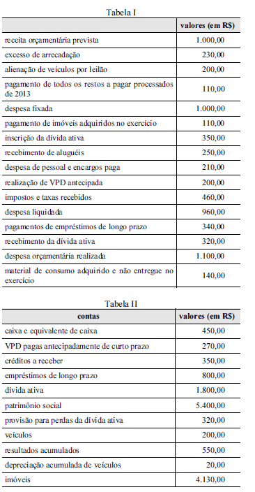 A tabela I contém informações apresentadas por determinado estado da federação referentes ao exercício de 2014, e a tabela II, os saldos de balanço patrimonial de 31/12/2013 do referido estado.