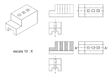 Com base nas representações em desenho técnico da peça ilustrada na figura acima, julgue os itens seguintes.