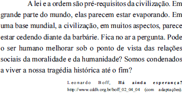 O texto defende a idéia de que a ordem e a lei, uma vez cumpridos, podem contribuir para a diminuição da violência, dispensando que cada ser humano contribua individualmente para um mundo melhor e faça cada um a sua parte.