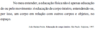 A partir da definição precedente, do Prof. João Batista Freire, que se tornou clássica para os estudos da educação física escolar para a infância, e considerando os processos de ensino-aprendizagem nos anos iniciais do ensino fundamental, assinale a opção correta.