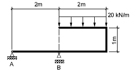 Considere o pórtico, com peso desprezível, submetido a um carregamento uniformemente distribuído e igual a 20 kN/m apresentado na figura abaixo: