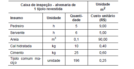 Após o término do projeto das instalações de esgoto sanitário de um prédio foi necessário orçar 10 caixas de inspeção de alvenaria com paredes de um tijolo comum maciço, revestidas. O orçamento baseou-se na planilha de composição de custos unitários abaixo.