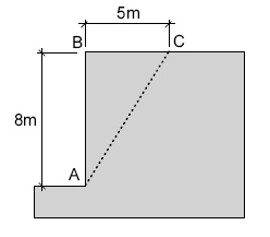 A figura acima mostra o corte de um trecho do terreno indicado pelas letras A, B e C relativo a um serviço de terraplenagem. Admitindo-se que as características geométricas da seção transversal apresentada no desenho se repitam por uma grande distância na direção normal ao plano do desenho e sabendo-se que o fator de empolamento do solo local é igual a 20%, pode-se afirmar que o volume de solo (V) a ser transportado por unidade de comprimento normal ao plano do desenho, expresso em m3 /m, devido à operação de corte é tal que