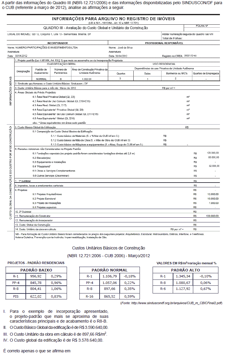 A NBR 12.721/2006 Avaliação de custos unitários e preparo de orçamentos de construção para incorporação de edifício em condomínio define os critérios para orçamentos de obras em condomínio. Emprega o Custo Unitário Básico para determinar o custo da obra, através de ponderações, de acordo com as características do prédio. A fi nalidade do método proposto na norma é o detalhamento do prédio para o registro em cartório, garantindo a condôminos e construtores um parâmetro de controle para a obra a ser executada, e facilitando a discussão de eventuais alterações que possam ocorrer durante a obra. De acordo com essa norma, responda às questões 2 e 3.