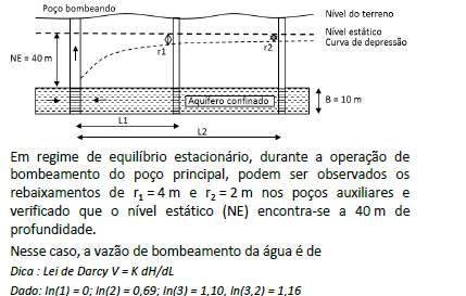 Durante a fase de projeto de um poço de captação de água subterrânea de um aquífero confinado que possui coeficiente de permeabilidade (K) de 15,0 m/dia e espessura (B) igual a 10 m foram perfurados dois poços de observação, às distâncias de L1 = 60 m e L2 = 192 m do eixo do poço.