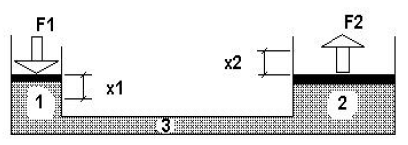 Quando o sistema representado pelo desenho estiver em equilíbrio, não haverá deslocamentos dos êmbolos. Nessa situação, qual será a pressão no ponto 3, sabendo-se que a força F1 é 50 quilogramas-força, a área do embolo 1 é 2 cm² e a área do tubo no ponto 3 é 1 cm²?