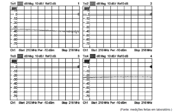 Os Parâmetros de Espalhamento, também conhecidos como Parâmetros S, são utilizados na caracterização de linhas de transmissão, em um modelo de quadripolos. A seguir, são exibidos gráficos que mostram os valores desses parâmetros, referentes à faixa de frequências de 210 a 216MHz, para um cabo coaxial. Nesses gráficos, gerados por um analisador de redes conectado aos terminais do cabo, o eixo das amplitudes tem os seus valores expressos em escala decibel e representam os níveis de reflexão nas portas do sistema (S11 e S22), bem como a comunicação entre as mesmas (S12 e S21).