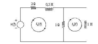 Considerando o circuito elétrico ilustrado na figura acima, na qual são identificadas as correntes de malha i1(t) e i2(t), julgue os itens a seguir.