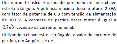 Um motor elétrico trifásico é solicitado em seu eixo por uma potência de 10 HP ( 1 HP = 746 W ). A alimentação desse motor é de 380 V de tensão de linha, seu rendimento é 0,8 e, nas suas condições de operação, o fator de potência é 0,9.