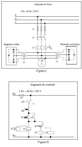 As figuras I e II ao lado mostram os diagramas de força e de controle do acionamento de um motor de indução trifásico com rotor em gaiola. Considere que esse motor possua corrente nominal de 52 A, que ele sempre parta com tensão nominal, aciona carga que exige conjugado constante, não tenha letra-código e possua elevação de temperatura admissível de 40 ºC. Com relação ao motor descrito, aos seus diagramas e acionamento, julgue os itens seguintes, considerando que todos os componentes do motor funcionam perfeitamente.