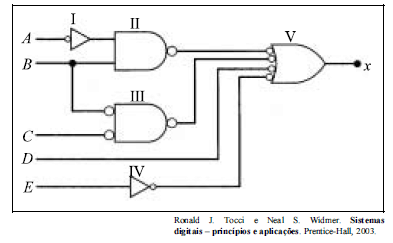 Se os valores lógicos das entradas A, B, C, D e E forem, respectivamente, 0, 1, 0, 1 e 0, então, a saída x assumirá o valor lógico 1.