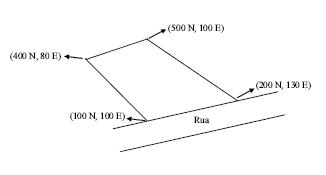 A figura a seguir ilustra uma planta sem escala de um terreno urbano. As coordenadas geográficas dos vértices, indicadas em metros nesse esboço, estão representadas pelas coordenadas em relação ao norte verdadeiro.