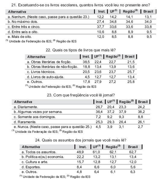 Responda às questões de nos 41 a 43 com base nos percentuais das respostas de alunos de uma área específica de determinada Instituição de Ensino Superior (IES), participantes do ENADE 2006, a algumas questões do questionário socioeconômico relativas aos hábitos de leitura.