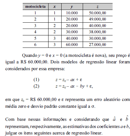 Considere que o modelo (2) seja adequado para descrever a relação entre x, y e z. Nessa situação, se uma moto, com um ano de uso, rodou 60.000 km e custa R$ 44.000,00 e se uma outra moto, com dois anos de uso, rodou 12.000 km e custa R$ 39.000,00, então, com base apenas nesses valores, é correto afirmar que a =12.000 e b = 0,1.