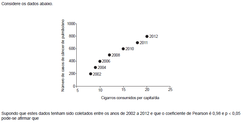 poderíamos correlacionar o avanço no número de casos de câncer pulmonar com o aumento no consumo de cigarros caso o coeficiente de Pearson fosse inferior a 0,7.